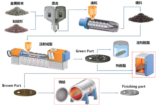 CIM工藝主要包括產(chǎn)品設(shè)計(jì)、模具設(shè)計(jì)、質(zhì)量檢測(cè)、混合、成型、脫脂、燒結(jié)、二次加工等8個(gè)重要環(huán)節(jié),我公司可根據(jù)客戶產(chǎn)品及工藝要求,定制脫脂和燒結(jié)設(shè)備,且可整合一起,提供真空脫脂燒結(jié)一體化設(shè)備。