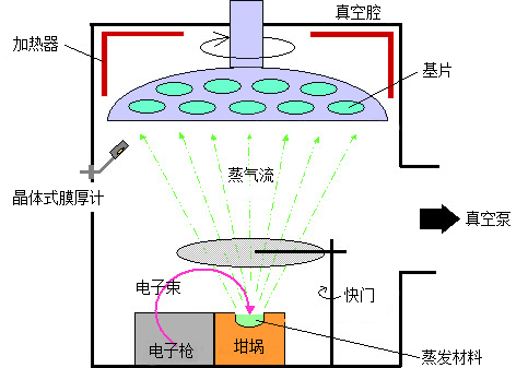 電子束蒸發(fā)的主要原理:高真空環(huán)境下,通過(guò)電子槍發(fā)出的高能電子,在電場(chǎng)和磁場(chǎng)作用下,電子轟擊ITO靶材表面使動(dòng)能轉(zhuǎn)化為熱能,靶材升溫,變成熔融狀態(tài)或者直接蒸發(fā)出去,在襯底表面沉積成ITO薄膜。