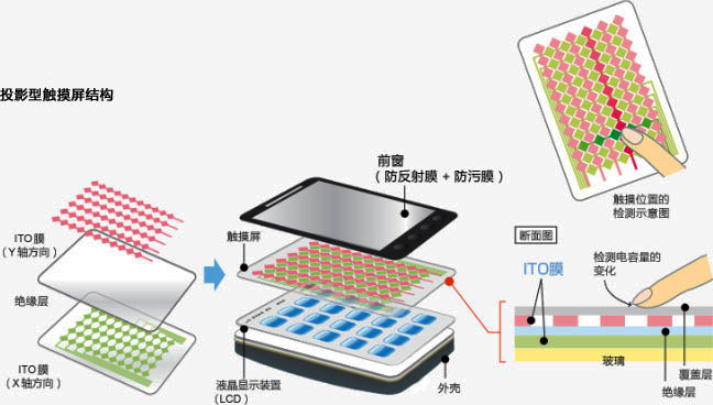有IPHONE引領(lǐng)的投射電容觸摸屏采用多層ITO層,形成矩陣式分布,以X軸、Y軸交叉分布做為電容矩陣,當(dāng)手指觸碰屏幕時(shí),可通過(guò)X、Y軸的掃描,檢測(cè)到觸碰位置電容的變化,進(jìn)而計(jì)算出手指之所在。基于此種架構(gòu),投射電容可以做到多點(diǎn)觸控操作。