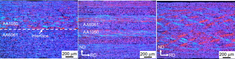 而su[2]等學(xué)者研究發(fā)現(xiàn)退火處理后的AA1050/AA6061板材經(jīng)過(guò)累積軋制的超細(xì)晶多層復(fù)合材料在不同道次下界面會(huì)呈現(xiàn)不同特征,初始三個(gè)道次內(nèi),不同鋁合金母材基本上能夠同步協(xié)調(diào)變形,但是當(dāng)軋制次數(shù)變多時(shí),AA6061界面就會(huì)發(fā)生頸縮,斷裂,最終發(fā)生界面紊亂。