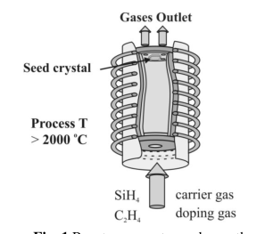 在密閉反應(yīng)器中,保持合適的反應(yīng)溫度(2000-2300℃)和壓力(40kPa),反應(yīng)爐內(nèi)通入由H2或者He載帶的SiH4和C2H4。反應(yīng)氣體在高溫下分解生成碳化硅并附著在襯底材料表面,并沿著材料表面不斷生長。通過控制反應(yīng)容積的大小、反應(yīng)溫度、壓力和氣體組分等條件,得到最佳工藝條件。