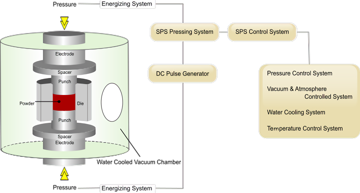 該技術(shù)是在加壓粉體粒子間直接通入脈沖電流,由火花放電瞬間產(chǎn)生的等離子體進(jìn)行加熱,利用場效應(yīng)、熱效應(yīng)等在低溫下進(jìn)行短時(shí)間燒結(jié)的新技術(shù)。SPS采用的是直流脈沖電流通電加壓燒結(jié)的方法,通過控制電流大小、脈沖的占空比、氣氛、壓頭的壓力、行程等參數(shù)來對工藝進(jìn)行控制。