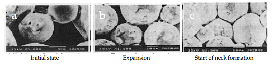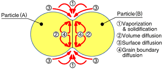 圖a顯示了由于等離子體中的火花引起的頸部形成的初始階段的行為。熱量立即從火花放電柱的中心傳遞到球體表面并擴(kuò)散,使得晶間結(jié)合部分快速冷卻。如圖b所示,其顯示了幾個(gè)頸部,脈沖在顆粒之間一個(gè)接一個(gè)地引起火花放電。即使單個(gè)顆粒,隨著重復(fù)放電,在相鄰顆粒之間形成頸部的位置的數(shù)量也增加。圖c顯示了SPS燒結(jié)晶界的狀態(tài),該燒結(jié)晶界在燒結(jié)進(jìn)一步發(fā)展后發(fā)生塑性變形。